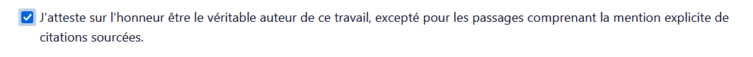 Remarque : pour certaines évaluations formelles, vous aurez à attester sur l'honneur le fait que vous soyez l'auteur du travail rendu en cochant la case obligatoire.